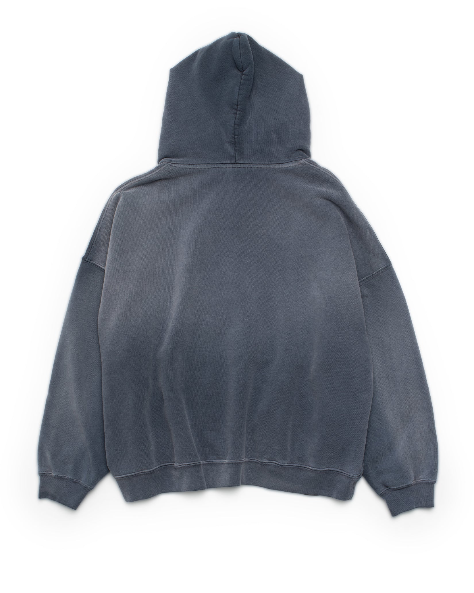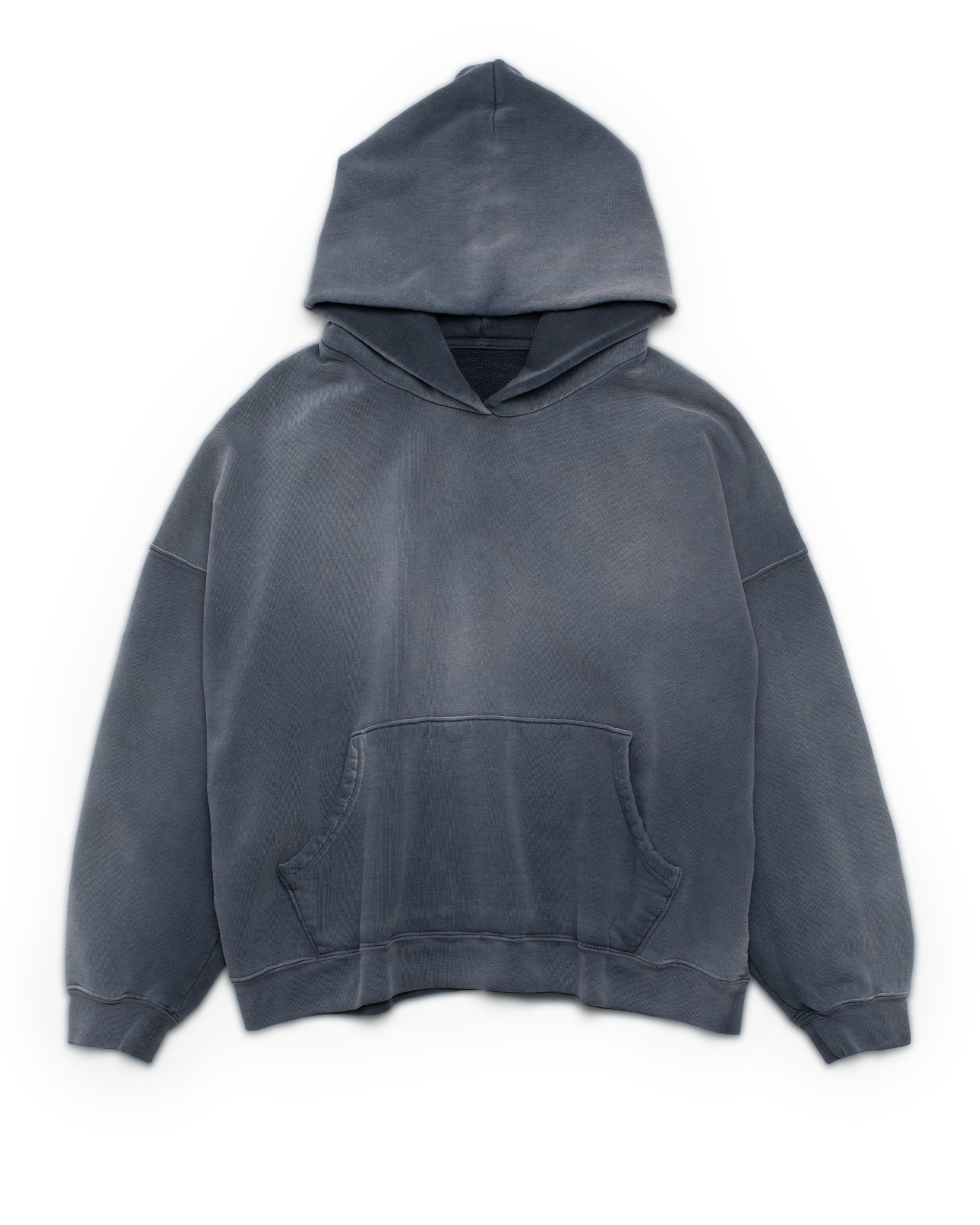 PRODUCED IN A RARE JAPANESE BRUSHED LOOPWHEEL FLEECE. SPECIALIZED FLEECE THAT TAKES ONE HOUR TO KNIT ONE METER OF FABRIC. THE VINTAGE LOOMS HANG THE FABRIC FROM CIRCULAR KNITTING MECHANISMS THAT KNIT AIR INTO THE FLEECE. THE RESULT IS A SLUBBY COTTON JERSEY THAT IS NOT ONLY HEAVYWEIGHT BUT BREATHABLE AND EASY TO WEAR. THE HOODIE FEATURES A SLOUCHY ATHLETIC CROPPED FIT, LARGE UTILITY FRONT POCKET, AND DEEP HOOD. VINTAGE WASH PROCESS. MADE IN USA.