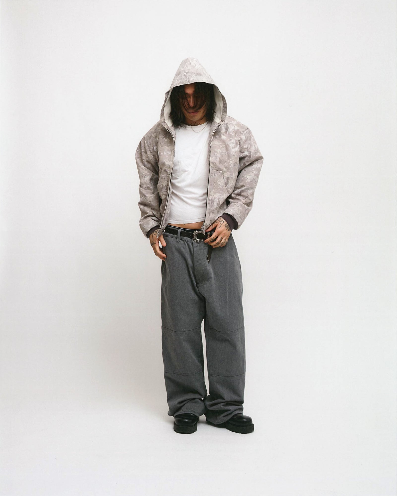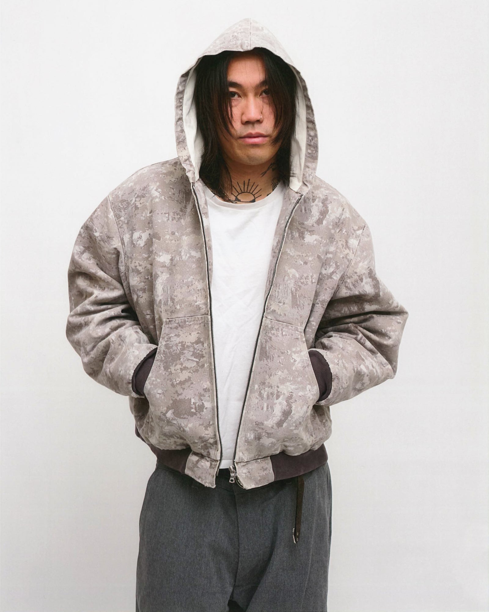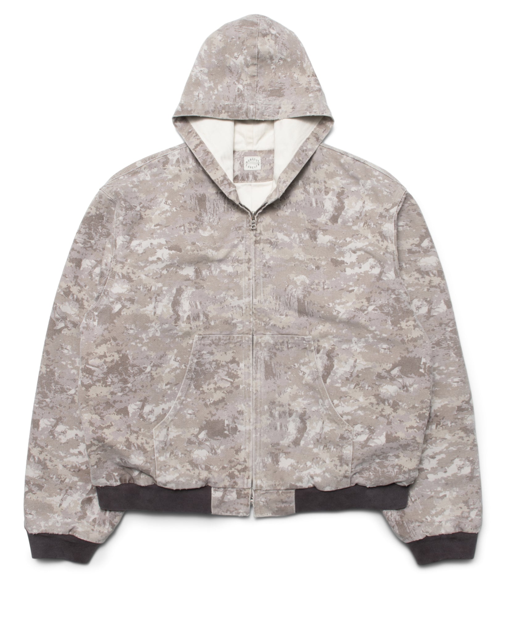 ZIP-FRONT HOODED JAPANESE CANVAS WORK JACKET WITH HERRINGBONE LINING. SPLIT PATCH POCKET ON FRONT THERMAL LINED. COTTON RIBBING. INTERIOR WELT POCKETS. MADE IN USA.