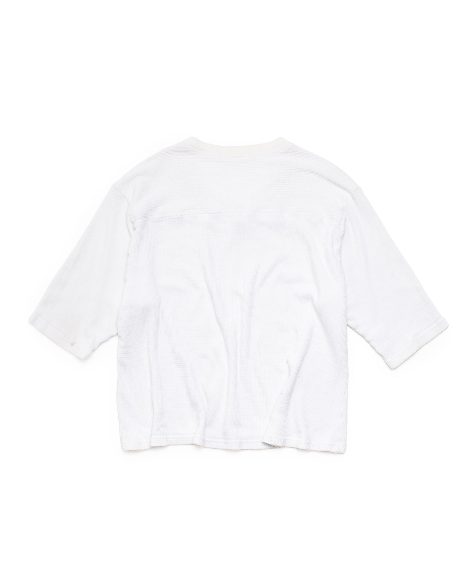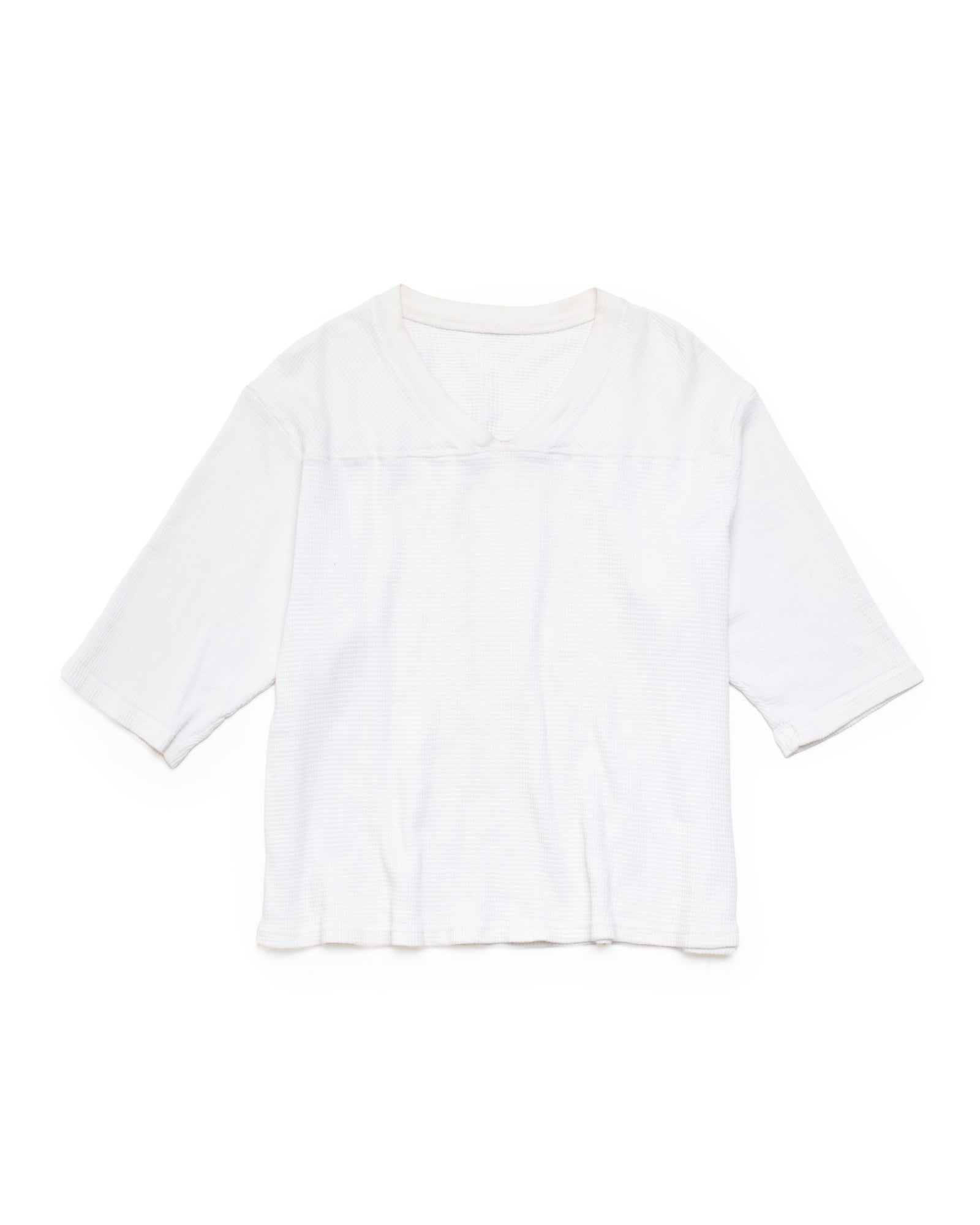 HALF-SLEEVE V-NECK JERSEY IN LIGHT WEIGHT COTTON THERMAL. BOXY FIT. RIB KNIT NECKLINE. DOUBLE STITCH HEM AT WAIST. VINTAGE WASH PROCESS. MADE IN THE USA.