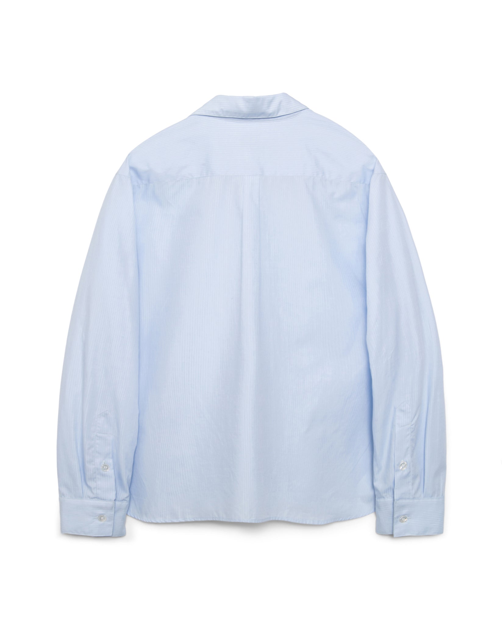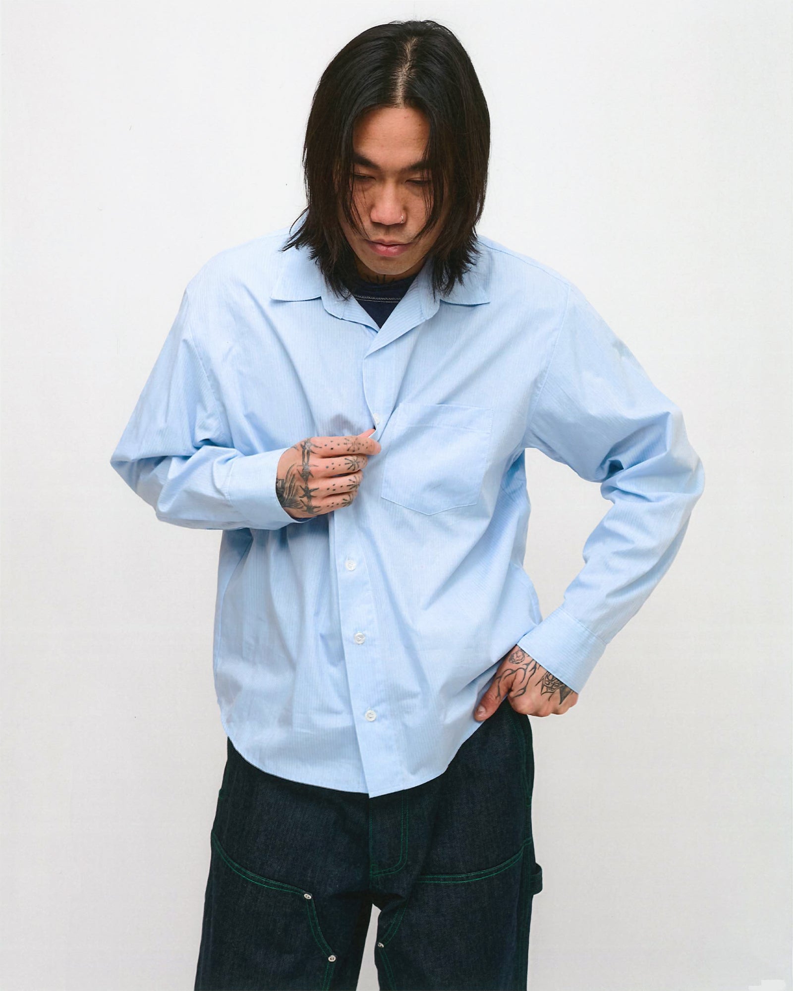Produced in a lightweight cotton Italian poplin fabric. Blue rope stripe that wrinkles with wear. The shirt features a boxy and slightly cropped fit, mother of pearl buttons, and double utility chest pockets with hidden pen pocket. Raf is 180 cm. tall and is wearing a size Medium.