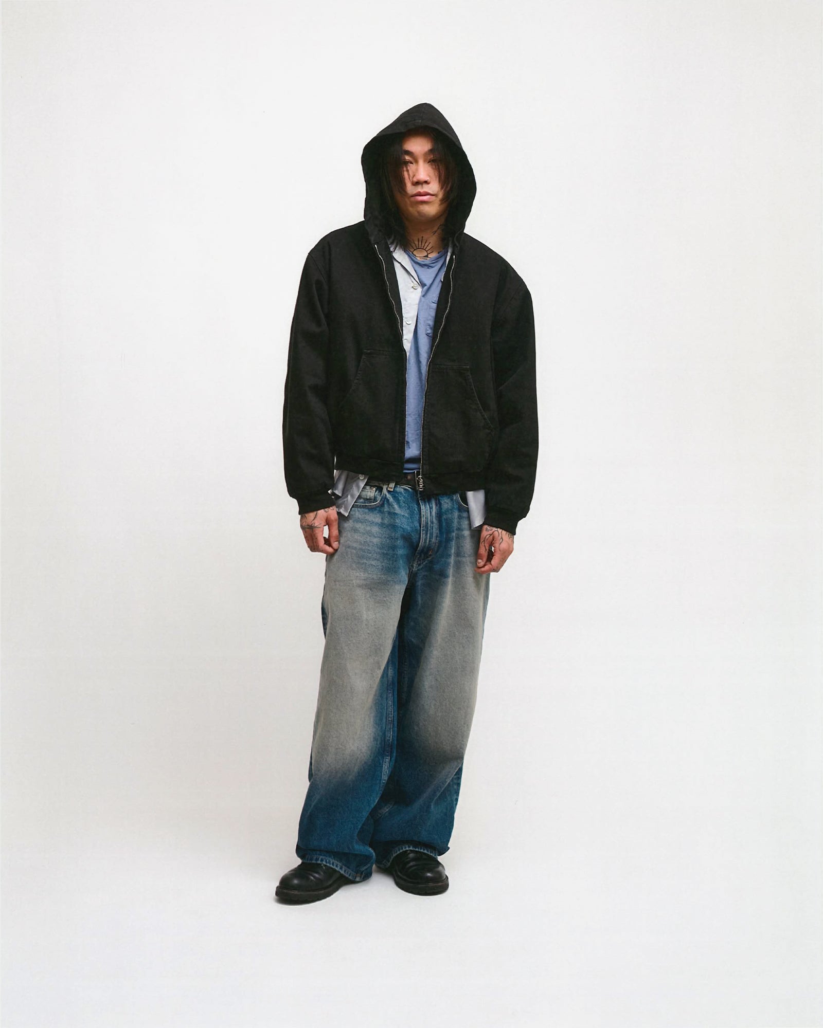 Produced in a lightweight cotton Italian poplin fabric. Blue rope stripe that wrinkles with wear. The shirt features a boxy and slightly cropped fit, mother of pearl buttons, and double utility chest pockets with hidden pen pocket. Raf is 180 cm. tall and is wearing a size Medium.